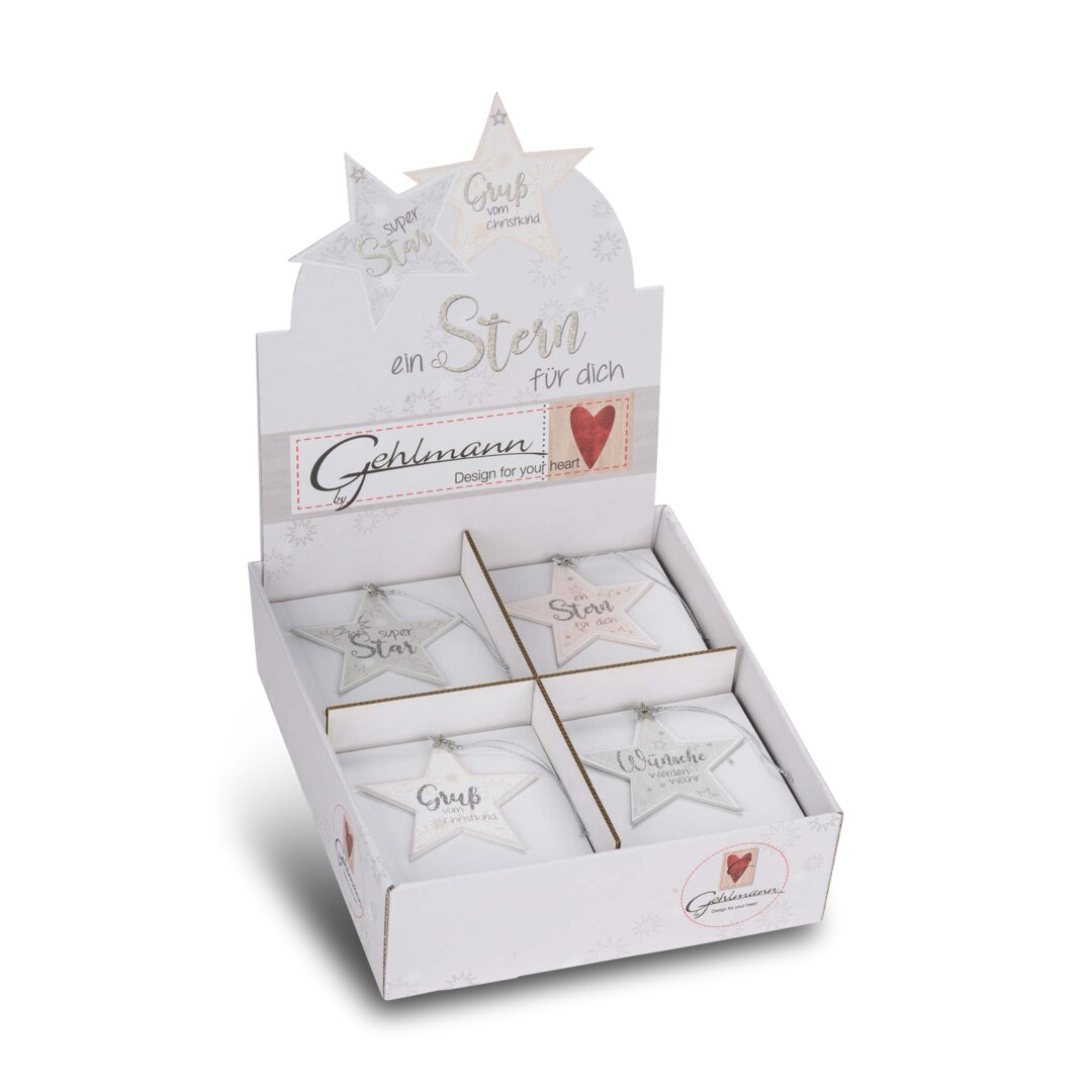 Display Holzsterne mit Gruß, 4 x 12 Anhänger