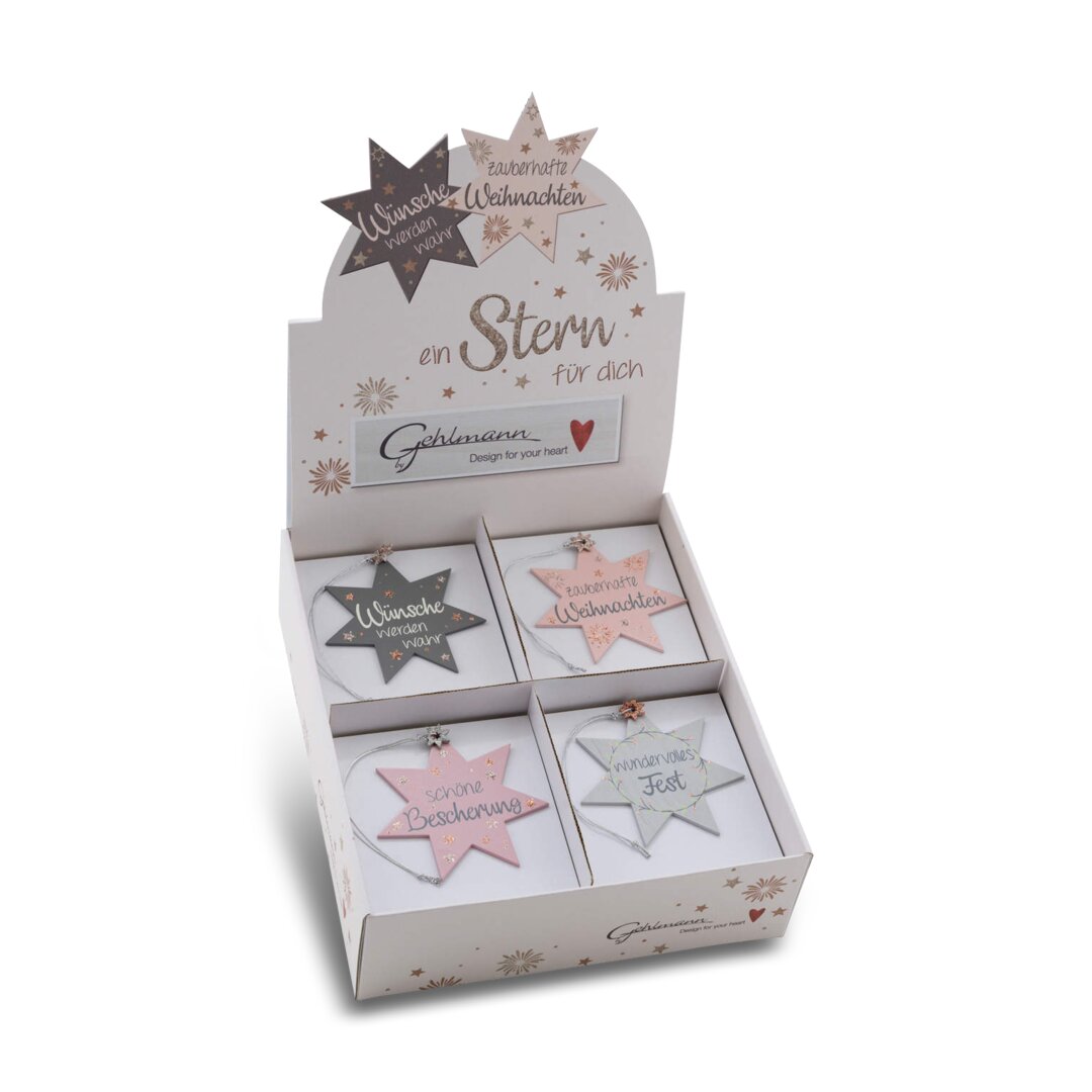 Display Holzsterne mit 7 Zacken, 4 x 12 Anhänger