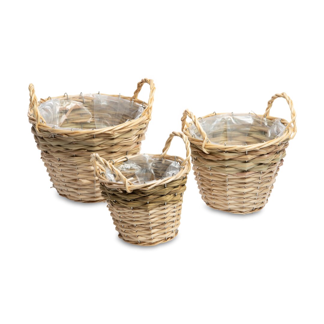 Weide/Halm-Pflanzkorb mit Henkeln, rund, natur, 3er Set