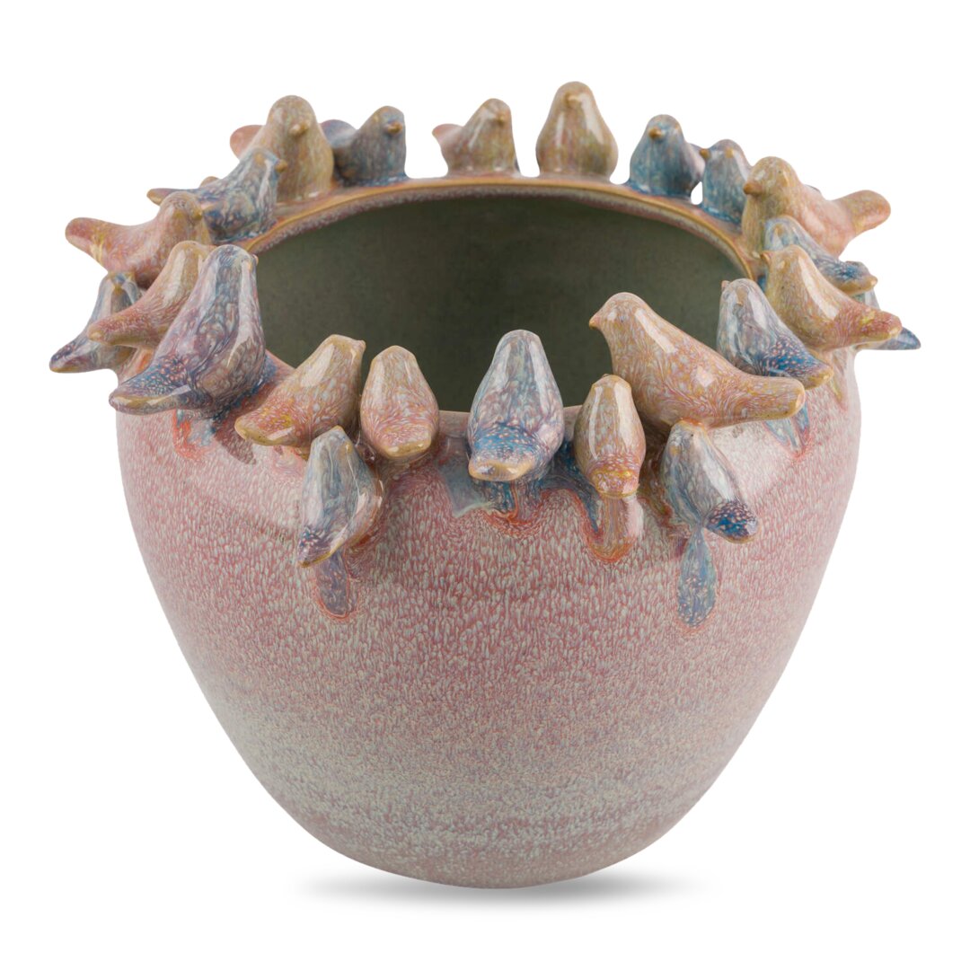 Steintopf "Vögel", rosa-blau, Ø 22 x 17 cm